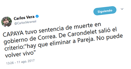 Según periodista Carlos Vera, gobierno de Correa habría tenido el criterio de «eliminar» a CAPAYA Ante la expectativa por el regreso del ex mnistro de Hidrocarburos Carlos Pareja Yannuzelli(CAPAYA) al Ecuador la tarde de este 11 de agosto, el reconocido periodista Carlos Vera, realizó esta mañana ... Leer más >> |
